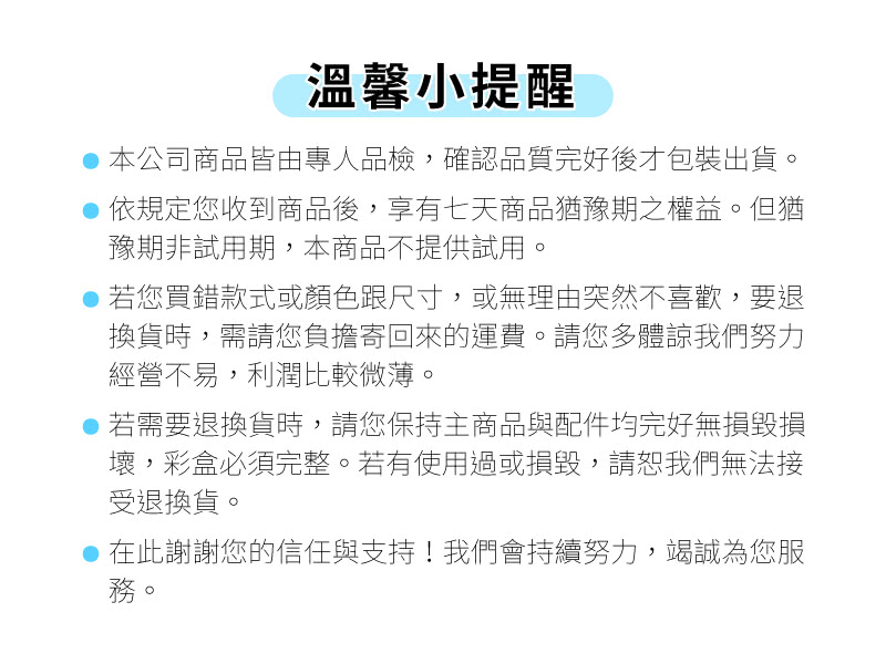 2.本商品不提供試用,商品如經拆封、使用、或拆解以致缺乏完整性及失去再販售價值時,將影響您退(換)貨權益。